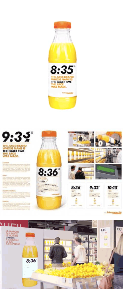 法國一家連鎖超市Intermarché的鮮榨柳橙汁,為表示其新鮮程度,直接就在瓶子的標簽上大大地印上了榨汁時間,每一瓶的榨汁時間都在變化。據(jù)報道,這瓶柳橙汁的逆襲,為超市增加了25%的來客數(shù),而且因為這個成功的包裝設(shè)計,3小時就贏得了5000萬次的曝光量。